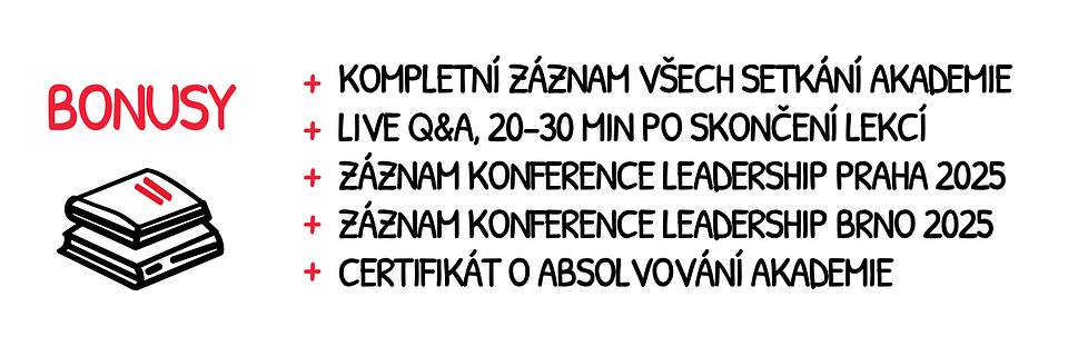 Tato akademie je tvořena třemi navazujícími webináři. V každém z nich získáte nové znalosti a praktická cvičení, které vám pomohou v roli lídra růst a přinést vašemu týmu větší přidanou hodnotu. Součástí akademie je také prostor pro diskusi nad konkrétními situacemi, se kterými se účastníci setkávají ve své praxi, což vám umožní okamžitě uplatnit nabyté poznatky v každodenním vedení.