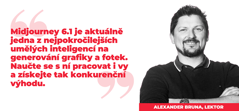 Společně s Alexem Brunou, expertem na generativní umělou inteligenci v marketingu a spoluzakladatelem agentury Ydeal, jsme pro vás připravili praktický webinář, na kterém se zaměříme na využití nejnovější verze Midjourney v6.1 a prozkoumáme její všechna zákoutí a pokročilá nastavení. Dozvíte se konkrétní ověřené prompty a to, jak vytvářet prompty vlastní. Teoretické základy doplníme o celou řadu příkladů a ukázek z reálné praxe, které přiblíží rozsáhlé možnosti tohoto AI nástroje.