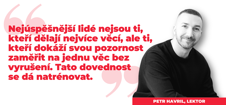 Dorazte na webinář a naučíte se, jak déle pracovat bez vyrušení a dokončit tak daleko více těch podstatných úkolů. Získáte praktické tipy, jak zlepšit svou pozornost a soustředění ve světě plném vyrušení – jak z okolí, tak z naší vlastní hlavy. Naučíte se mít více flow a hluboké práce každý den. Získáte tak zpět kontrolu nad svou pozorností a budete mít daleko větší efektivitu své každodenní práce a ve výsledku i více klidu a méně stresu.