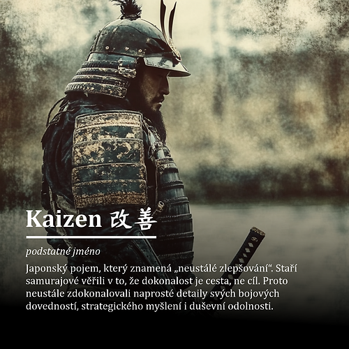 Kaizen (改善) je japonský pojem, který znamená „neustálé zlepšování“. Staří samurajové věřili v to, že dokonalost je cesta, ne cíl. Proto neustále zdokonalovali naprosté maličkosti ohledně bojových dovedností, strategického myšlení i duševní odolnosti.