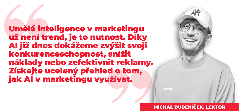Připravili jsme pro vás webinář s Mikem Bubeníčkem, CEO agentury Etnetera Motion. Mike je také autorem marketingového podcastu Mike:ON, externě vyučuje brand marketing na Karlově Univerzitě a absolvoval exekutivní postgraduální program digitální strategie na Harvardu. Webinář je vhodný jak pro mírně pokročilé, tak pro lidi, kteří pracují v marketingu či se o marketing zajímají. Zároveň máte možnost získat certifikát a obohatit svůj životopis či zvýšit svoji hodnotu na trhu práce.