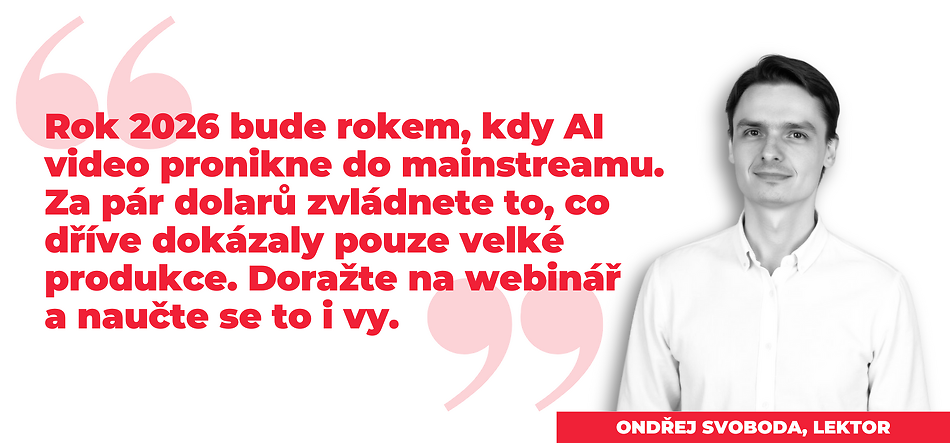 Webinář povede Ondřej Svoboda, který je jeden z českých průkopníků v oboru AI video tvorby a držitel ocenění Osobnost AI roku 2025 v kategorii Kultura. Tento webinář je vhodný pro začátečníky a mírně pokročilé, v ceně je kompletní záznam a můžete také získat certifikát o absolvování a zvýšit svoji hodnotu na trhu práce.