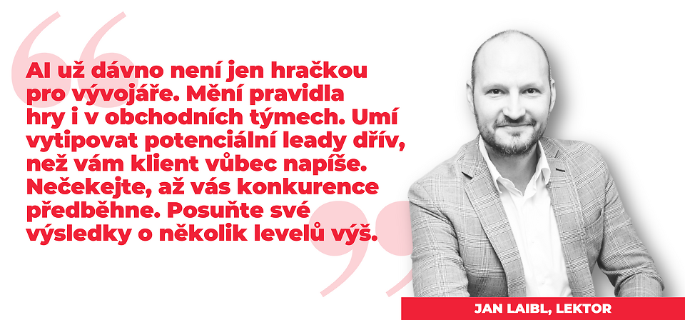 Na webináři se dozvíte, jak AI přetváří způsob, jakým obchodníci pracují, a jak i vy můžete začít už dnes. Získáte nástroje, díky kterým se dokážete soustředit na to nejdůležitější a to budování vztahů a uzavírání obchodů. Webinářem vás provede zkušený obchodní stratég Jan Laibl.