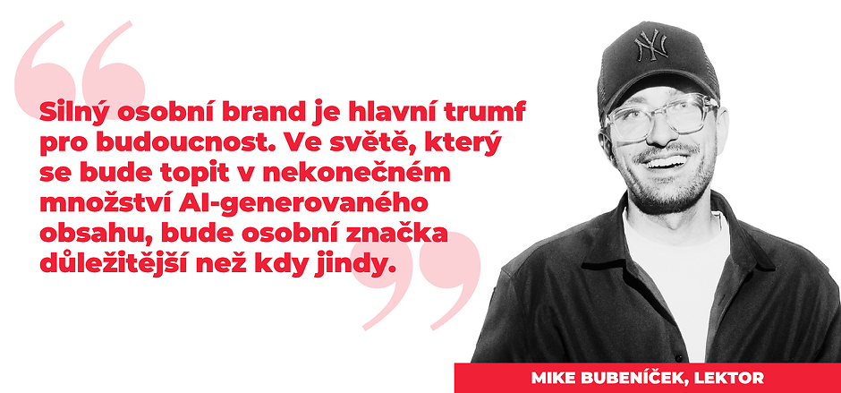 Připravili jsme pro vás webinář s Mikem Bubeníčkem, marketingovým expertem na téma brandu a nových technologií. Během webináře získáte nadhled nad tím, co se v současném světě brandingu děje a „kudy běží zajíc“. Naučíte se mnoho praktických tipů a strategií, jak můžete svůj osobní brand zlepšit a připravit ho na výzvy spojené s umělou inteligencí.
